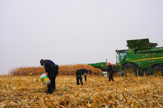 “雪下这么大,我正愁玉米没法收呢,没想到警察同志来帮忙了!” 看着田间忙碌的民警,依兰县农户李阿姨难掩感激之情。以雪为令,依兰县公安局组建的“助农志愿服务队”第一时间奔赴田间地头,协助农户开展抢收工作,确保劳动果实颗粒归仓。