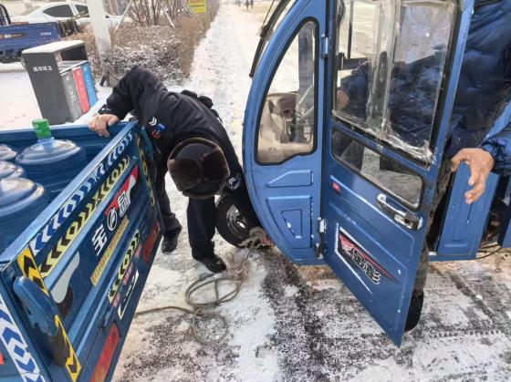 11月27日,哈尔滨市通河县公安局长安派出所巡逻民警在执勤途中发现一辆满载水桶的蓝色三轮车因路面湿滑陷入困境,车主正站在车旁焦急无措。