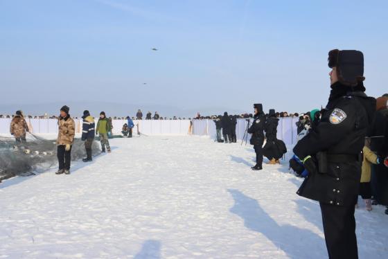 构建立体防控圈,织密冰雪平安网。面对景区冬捕节等活动“集中式”聚客的特点,宾县公安局打破传统巡防模式,创新推行构建“空地联动、人机协同、点线面全覆盖”的立体化防控体系。在景区入口、冬捕现场等重点区域,实行“定点值守+流动巡查”相结合的勤务模式,根据不同点位特点量身定制安全提示,重点提醒游客“远离冰面裂缝区域,切勿擅自进入非划定活动区”、叮嘱“控制车速保持车距,安全第一畅享激情”。同时,启用无人机搭载高清摄像与高音扩音设备,在冰面承载力易波动时段开展高频次空中巡防,实时监测人流密度与冰面状况,一旦发现风险隐患或人流聚集,立即调度地面警力精准疏导管控,严格落实“1、3、5分钟”快速响应机制,确保“及时预警、快速处置”,让平安成为游客畅游冰雪秘境的最温暖底色。