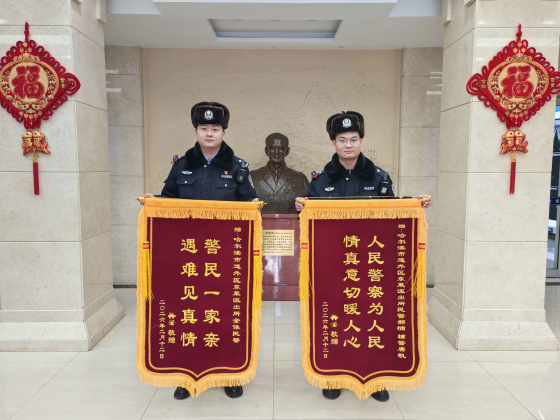 2月12日,哈尔滨市公安局道外分局东莱派出所收到了姜女士从吉林省寄来的两面写着“人民警察为人民 情真意切暖人心”与“警民一家亲 遇难见真情” 的锦旗,感谢东莱派出所民警辅警帮助她找回离家出走的女儿。